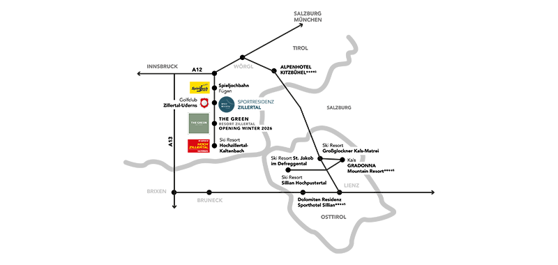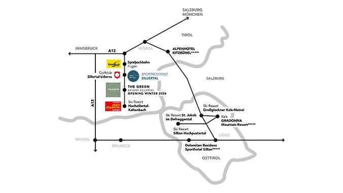 Über die A12 bis zur Ausfahrt Zillertal und anschließend weiter auf der B169. Aus Süden (Klagenfurt | Graz): Über die A10 bis Salzburg bzw. bis zur Ausfahrt Bischofshofen, anschließend der Beschilderung Richtung Zillertal folgen.